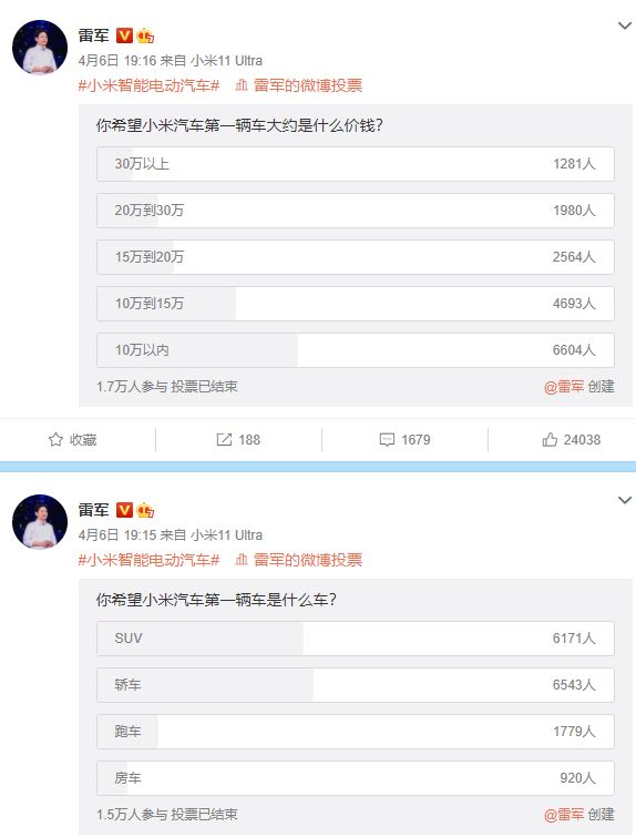 早在去年4月份,也就是小米宣布造车的一个月内,雷军就非常接地气地通过微博向粉丝们发起了3轮投票: