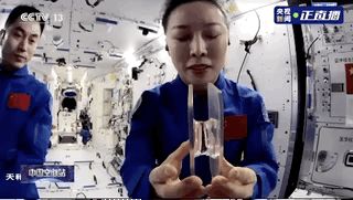 而在“水油分离”实验中,叶光富化身“人工离心机”,转动水油混合的小瓶,使用旋转的方式,借助离心作用,使其中的水油在微重力的条件下也能再次分离。