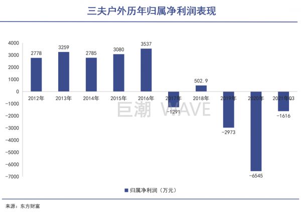 除了名声响亮但叫好不叫座的探路者之外,另一家代表性的户外企业三夫户外,也在遭遇类似的困境,上市至今越亏越多。