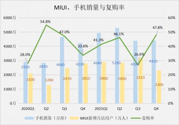 小米对高端特别执着,所以从小米11、11ultra等机型开始就一直在不断堆料。然而,除了米粉之外似乎其他用户对“高端化”后的小米仍不感冒,而更让小米欲哭无泪的是复购率在去年Q3也出现了下跌为26.9%,创下了近三年来最低的纪录。