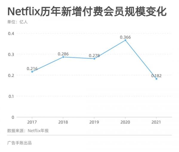 比如流媒体收入增速逐年下滑,从2018年的37.28%下降到2021年19.22%:付费会员规模年增率也从26.26%收窄至11.64%;另外,每年新增付费会员也出现了下滑,从2020年的3660万下降到了去年的1818万。