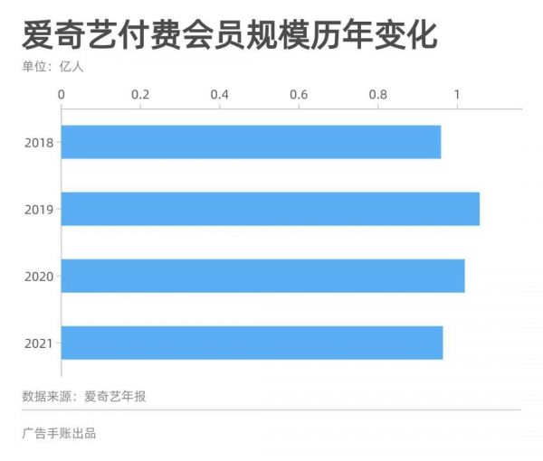 即便定价不低,爱奇艺的会员收入也呈现出后继乏力的迹象。在2021年,爱奇艺披露的会员收入为167.13亿元,同比增幅仅有1.35%;如果在更长的时间轴上观察,它的会员收入增长从2017年开始就已经逐年下滑。