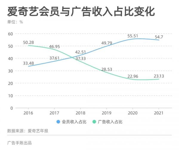 2016年,在线广告收入在爱奇艺总收入中的占比为50.28%。但随后,会员收入占比开始一路向上,而广告收入占比开始大幅下滑。两者的地位在2018年完全调转,到 2021年,会员收入已经成为了爱奇艺收入的大头,广告收入的占比已经收窄至23.13%。