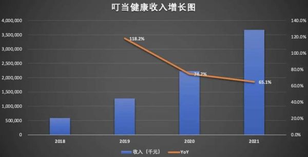 更新后招股书披露,2019年、2020年及2021年,叮当健康实现收入分别为12.76亿元、22.29亿元及36.79亿元。据此前招股书披露,叮当健康2018年的收入为5.85亿元。2019年至2021年,营收同比增速分别为118.2%、74.7%和65.1%,增速呈现放缓趋势。
