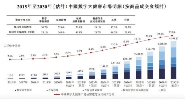 弗若斯特沙利文报告显示,中国的医疗总支出2020年超过7.2万亿元,预期于2030年将达到17.6万亿元,2020年至2030年的复合增长率为9.3%。2020年中国数字大健康市场规模达到3074亿元,预期2030年将快速增长至4.2万亿元,2020年至2030年的复合年增长率为29.8%。数字大健康市场则主要包括数字零售药房、在线诊疗、在线消费医疗及医疗信息技术基础设施等。