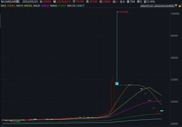 3月22日,伦镍期货迎来五连跌,跌破3万美元/吨关口。截至当日收盘,LME综合镍3M合约报2.85万美元/吨,下跌9.23%,伦镍价格回到了3月7日开盘价附近。