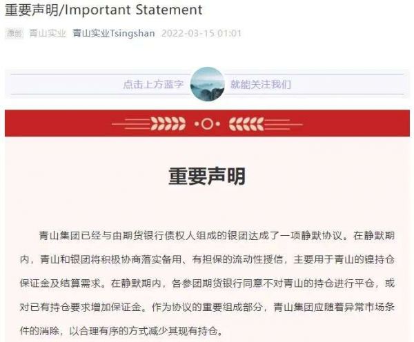 而从3月15日的相关声明内容来看,青山集团方面和由期货银行债权人组成的银团达成静默协议,银团同意不对青山的持仓进行平仓,或对已有持仓要求增加保证金。