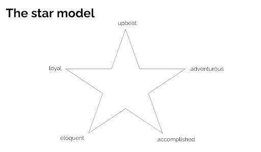 你还可以把这五个词看作是五角星的五个角。其中,五角星的顶端是你最希望拥有的特点。“尝试让每个形容词都能够与两条对角线另一端所对应的词形成一定程度的对立。”杰克逊说,“例如,以下图为例,某个雄辩的人并不一定是你觉得乐观的人。”