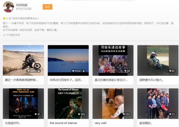 梅花创投的吴世春在视频号上很活跃,经纬中国的张颖把视频号当微博发了,时常分享喜欢的“鸡汤”和前沿科技。