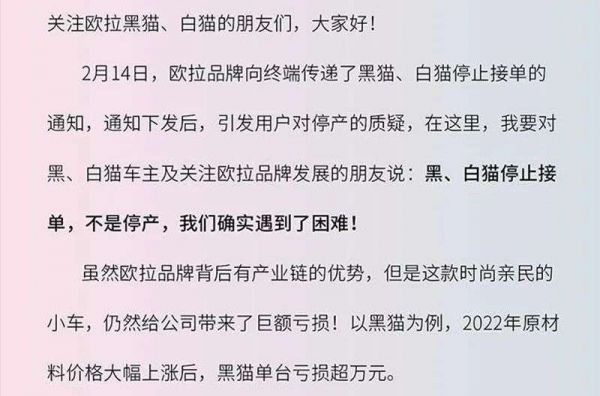 在多重因素带来的压力下,欧拉最先扛不住了,旗下黑猫与白猫上个月开始就停止接收新订单。欧拉汽车CEO 董玉东表示,欧拉汽车这两款车型给公司带来了巨额亏损,以黑猫为例,进入2022年原材料价格大幅上涨,每卖出一台亏损高达万元,出现了卖得越多亏损越多的局面。
