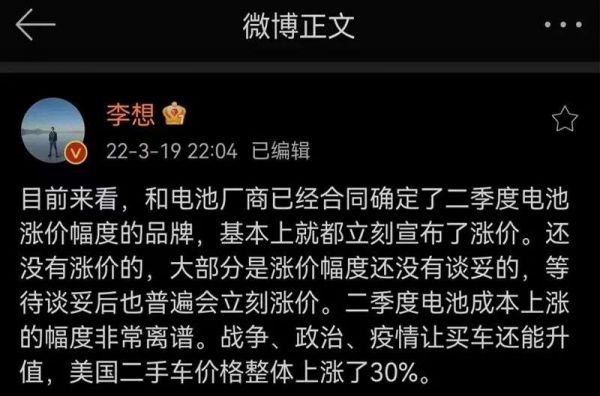 对于这波集中涨价,李想在某社交平台解释说:“目前来看,和电池厂商已经合同确定了二季度电池涨价幅度的品牌,基本上就都立刻宣布了涨价。还没有涨价的,大部分是涨价幅度还没谈妥的,等谈妥后也普遍会立刻涨价。”