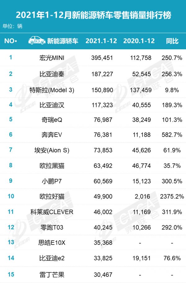 目前的纯电动市场,A00+A0市场的占比达到了四成以上。最重要的是,这一细分市场基本是传统车企统治的天下。据乘联会数据显示,2021年新能源轿车零售销量排行榜前15名中,A0/A00车型就占据了9款,包括五菱宏光MINIEV、奇瑞eQ、长安奔奔E-Star、欧拉黑猫、比亚迪e2等。