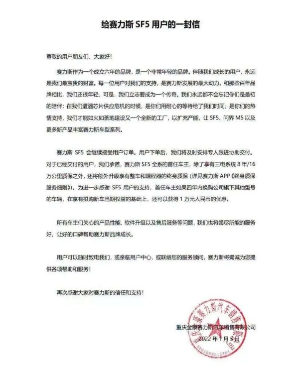 后续的维修保养如何保证?作为智能汽车核心系统升级服务怎么保障?面对种种质疑,塞力斯品牌官方在1月5日发布了《给赛力斯SF5用户的一封信》,声称将安排专人进行协助维护,并有继续接受订单的安排。