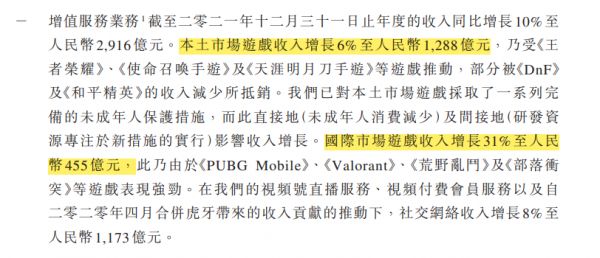 在财报中,腾讯将游戏收入分成本土和国际市场两个板块。按照全年计算,本土市场游戏收入增长 6% 至 1288 亿元,国际市场游戏收入增长 31% 至 455 亿元。