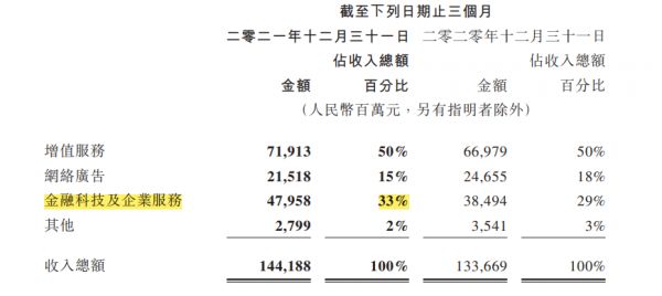 腾讯金融科技和企业服务板块第四季度营收 479.58 亿元,占比提升至 33%,首次超过游戏板块;金融科技和企业服务全年收入则同比增长 34% 至 1722 亿元。