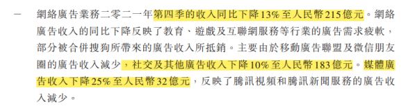 2021 年第四季度,腾讯网络广告收入 251 亿元,同比下降 13%。其中,媒体广告收入下降 25% 至 32 亿元,社交及其他广告收入下降 10% 至 183 亿元,在分发渠道上则体现为腾讯视频和腾讯新闻服务、微信朋友圈广告广告收入的减少。