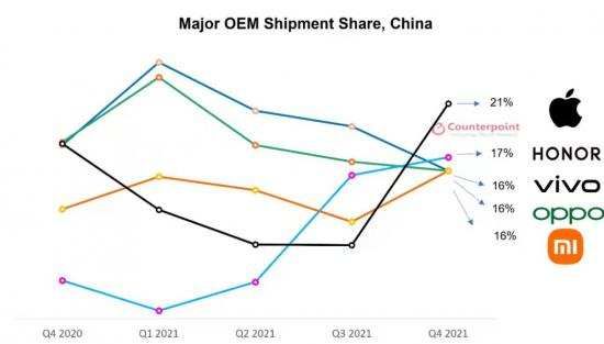 2021年第四季度,荣耀接替华为成为国产、安卓阵营手机双料第一。总排名上仅次于苹果21%的市占率,国内手机厂商排名中,高于vivo、OPPO、小米。进入2022年之后倒也势头不减,1月底的周市场占有率为17%,销量在1月的最后两周比前两周大涨32%。