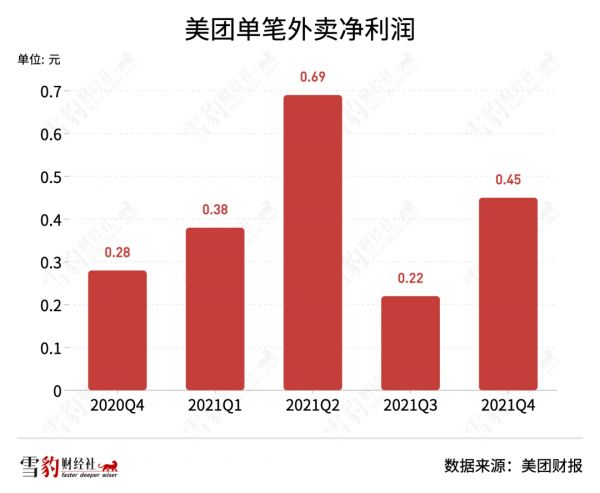 在供给端方面,虽然受宏观环境影响,部分消费者对价格更加敏感,但美团对供给端的优化更加注重高质量增长,Q4外卖单价从去年同期的46.9元涨至48.2元。单笔订单利润为0.45元,同比、环比分别大涨61%和105%。