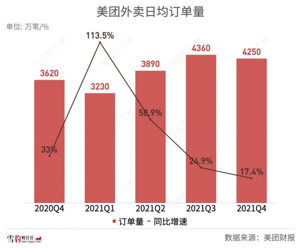 体现在季报上,则是四季度餐饮外卖日均订单量为4250万,同比增长17.4%,但增速进一步下滑。