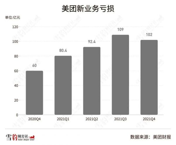 在两大业务保持稳定增长的同时,作为第三板块的“新业务”依旧与以往一样,吞噬着外卖和到店酒旅来之不易的净利润,Q4新业务营亏损102亿元,而外卖及酒旅合计盈利为56.4亿元。