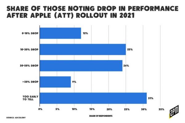 广告主占比(按下降幅度)|来源:Adcolony苹果隐私政策后,表示营销效果变差的