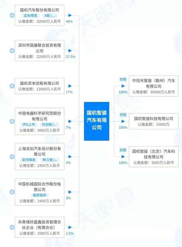 天眼查信息显示,国机智骏汽车有限公司,是由国机集团组织旗下企业成立的、拥有自主知识产权的新能源汽车制造公司,该公司致力于打造中高端汽车品牌。股权信息显示,其大股东为国机汽车股份有限公司,持股40%,而国机汽车的控股股东为央企中国机械工业集团有限公司,持股70.54%。