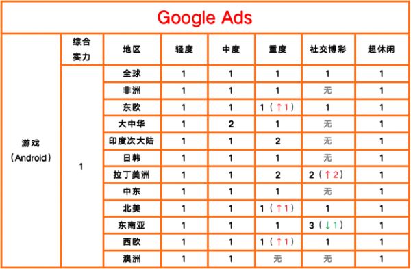 时隔半年,在轻度游戏、超休闲游戏、中度游戏(除大中华地区)三个领域的全部市场,Google都稳坐桂冠,而且在重度和社交博彩类游戏的实力也进一步强大,近乎包揽所有第一名。
