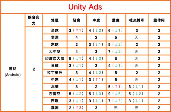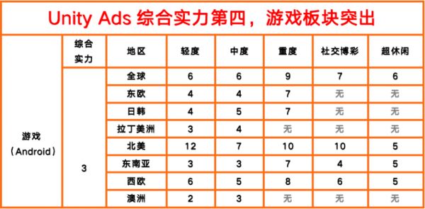 整体上看,Unity Ads在绝大多数地区的重要游戏细分领域中,都稳坐前5名。榜上虽然出现了大面积排名下滑,但可以看到,在最为重要、游戏买量成本最高、留存最难做的北美重度游戏市场,其排名仍在稳步上升,再加之在超休闲领域全部位列第二位,Unity Ads在所有主要战场都表现非常良好,实力强劲。
