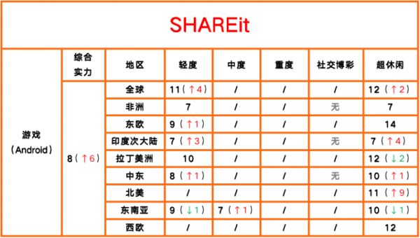 其三,SHAREit在全品类留存实力榜上升5位至第11,游戏领域的留存实力上升6位至第8,势头也很猛。