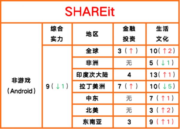SHAREit在整体IAP综合实力榜排名第7,较13版报告的第25名实现大幅跃升。