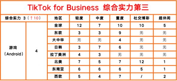 其二,TikTok For Business全品类留存实力榜第12较去年上升7名,游戏品类第7较去年上升10名,整体涨势非常好,但在非游戏品类或可加大布局力度;