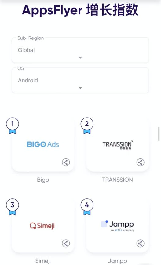 在增长指数榜单中,中国平台Bigo、TRANSSION、Simeji包揽了前三名。
