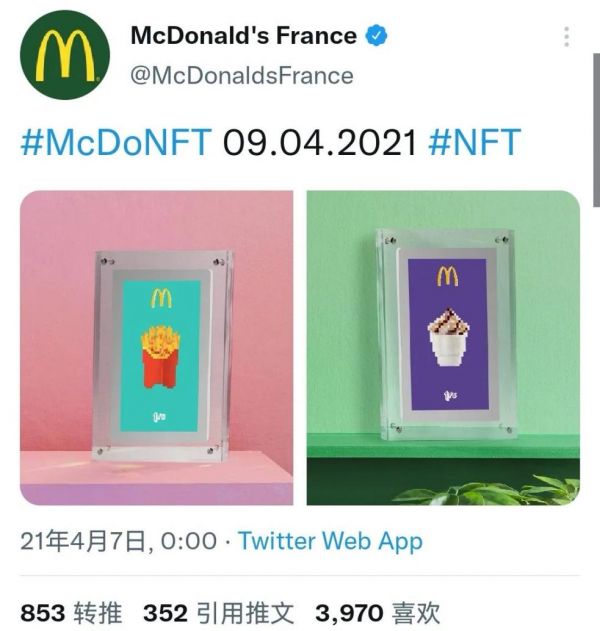 2021年4月9日,麦当劳法国在推特发布了其食品系列NFT“McDoNFT”,包含薯条、巨无霸和圣代等共20个美食NFT创意作品。