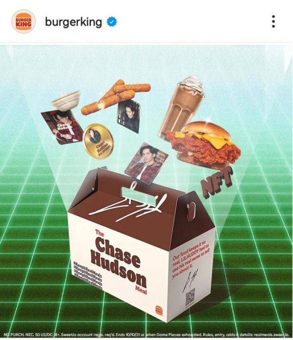 汉堡王紧随其后在2021年9月推出了名为“Keep It Real Meals”(“真材实料”)的活动,并邀请Nelly、Anitta等名人参与,为活动增添热度。同时,汉堡王也跟随麦当劳等餐饮品牌的脚步,积极探索属于自己品牌的“NFT+美食”。他们选择了与NFT市场交易平台Sweet联动合作开发了一个NFT收藏品游戏。该活动需要用户扫描汉堡王的“Keep it real meal”产品包装盒上的二维码,来收集共三款收藏品游戏。而三款游戏集齐后,用户会获得随机获得一种奖励——3D数字收藏品、一年免费的Whopper三明治,或与品牌明星大使亲笔签名的商品或通话机会。这样与NFT的融合在具有趣味性的同时也可以刺激用户的收集欲,间接引导用户更多地购买品牌产品。