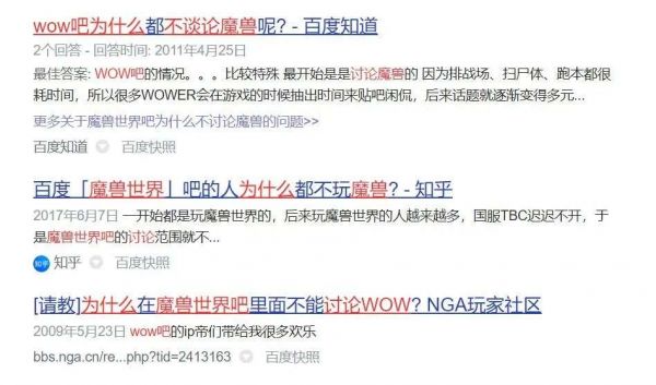 即使现在你去搜索“魔兽世界吧”的关键词,被关联到的搜索词条中,仍有“魔兽世界吧为什么不讨论/不谈论魔兽”这样的关键词条位列前排。