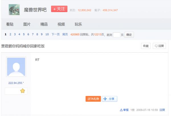 且当时在如大海般庞大的帖子之中,不乏精品爆贴的出现,一个多月后“贾君鹏你妈妈喊你回家吃饭”一贴引起了“魔兽世界吧”吧友的全民参与,而由这个本只有一个标题的IP匿名贴开始的极限水贴和“亲戚拟造”行为,为其贴吧筑起了一座丰碑,也让“魔兽世界吧”越来越出圈。