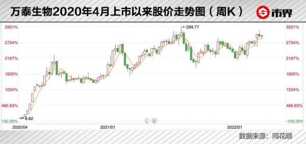 这一巨大的市场前景也在2020年4月万泰生物成功登陆上交所后,体现得淋漓尽致。从发行价8.75元开启暴涨模式,最高时触及299.77元/股,堪称A股绝对黑马。