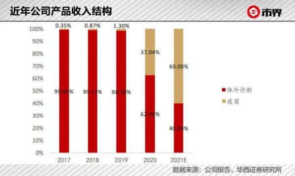 2019年,万泰生物营收为11.84亿元,净利有2.09亿元,其实可以说99%的营收都是由体外诊断产品贡献的。