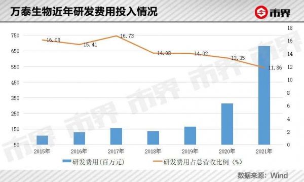 虽然目前双方处于合作的甜蜜期,但这种过度依赖校企合作的模式,也让万泰生物自身的独立研究能力备受外界质疑。其研发费用占比也在不断下滑,2021年万泰生物投入研发费用为6.82亿元,占营业总收入的11.86%,但已经较2015年16%下滑超4个百分点。