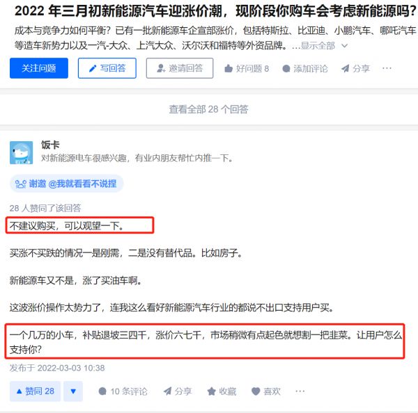 在知乎“2022年三月初新能源车迎涨价潮,现阶段购车你会考虑新能源吗”问题下方,排在最前的高赞回答赢得了不少网友的认可。答主“饭卡”直言,车企是看市场稍微有点起色就想割一把韭菜: