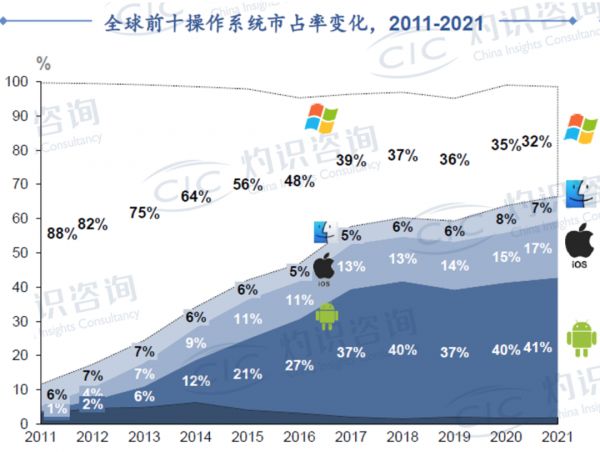 此外,CIC灼识咨询提供给《豹变》的全球操作系统市占率变化数据显示,2021年,Windows、macOS、iOS和安卓的市占率累计高达97%。