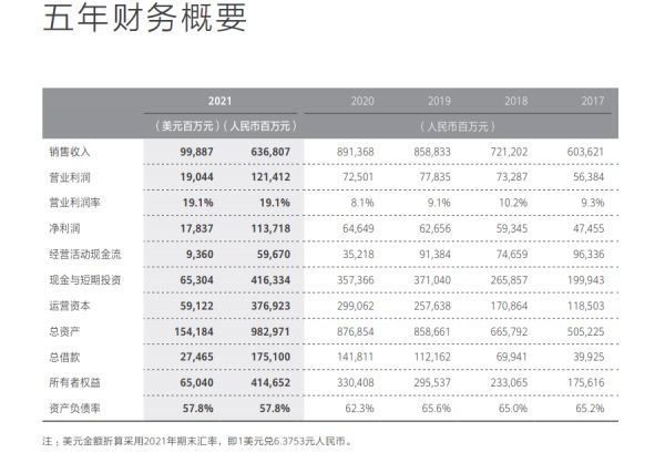 2021年华为实现净利润1137 亿元,同比增长75.9%,净利润率达17.9%,经营现金流增长 69.4%,现金存量充足;资产负债率从62.3%下降至57.8%,资本结构得到改善。通过简化管理、充分运用数字化技术,持续提升内部运营效率,销管费用同比降低93亿元。
