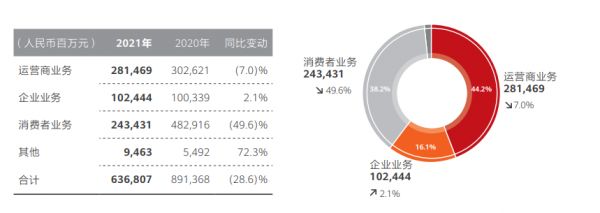 在运营商、消费者、企业业务三大板块中,华为除了企业业务略微有所增长,消费者业务和运营商业务均下降。其中,企业业务营收1024亿元,同比增长2.1%,消费者业务下滑最为严重,营收2434亿元,同比下滑49.6%,运营商业务营收2815亿元,同比下降7%。