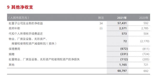 在华为其他净收支营收中,处置子公司以及业务的净收益达到674亿元,政府补助26亿元。2020年11月,华为甩包袱,正式出售荣耀。可以猜测,处置子公司以及业务的净收益为荣耀出售相关收益。