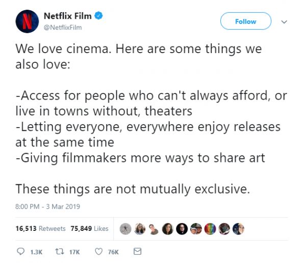 没有在电影院大银幕上映的作品,还能叫电影吗?当时鄙视流媒体的不只是奥斯卡,还有戛纳。由于戛纳电影节规定参赛作品必须是院线电影,Netflix愤然拒绝参赛。正因为这一原因,《罗马》那年拿到了威尼斯的金狮,却没有戛纳的金棕榈。