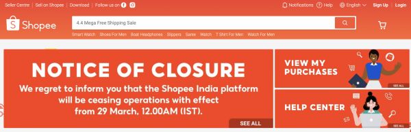 首页4月购物节大促的广告还在,Shopee 印度站已于昨日宣布将于印度时间3月29日关停。