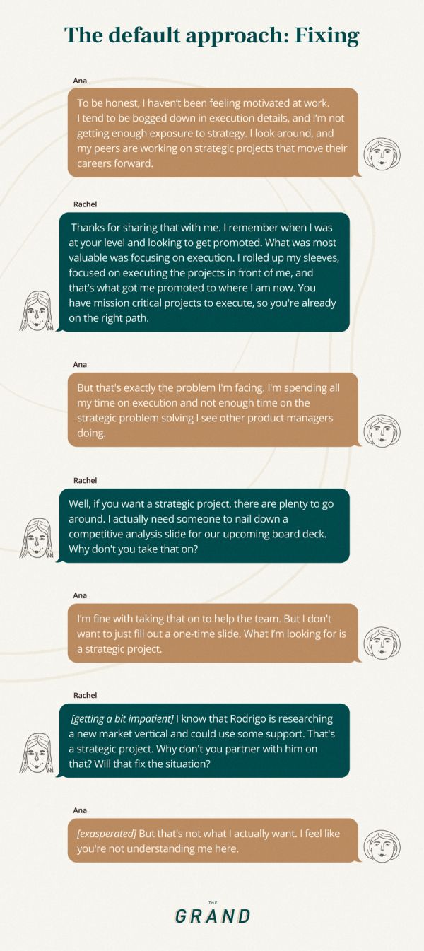 以下是管理者瑞秋(Rachel)和其直接下属安娜(Ana)的沟通示例。如果瑞秋采取的是“授之以鱼”的方法,那么她们的对话就会是这样: