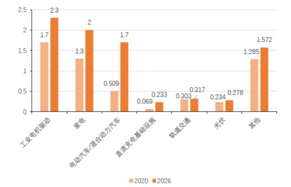 图3:2020-2026年,功率半导体中的IGBT在不同应用市场的发展预测(十亿美元),资料来源:天风证券
