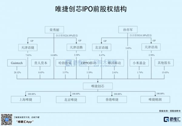 IPO前,荣秀丽直接持有公司14.8%的股份,并通过天津语捷、天津语腾间接控制公司合计9.39%股份,孙亦军则通过直接或间接的方式合计持股占比14.10%,两人合计持股占比38.29%,为公司实际控制人。除此之外,Gaintech、贵人资本、哈勃投资、OPPO移动分别持股占比28.12%、8.65%、3.57%、3.39%。