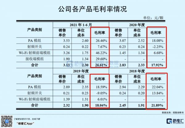 具体来看,PA模组作为核心产品,毛利率由22.04%下降至18.08%。